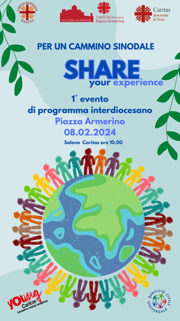 Il prossimo 8 febbraio alle ore 10, presso il salone della Caritas diocesana di Piazza Armerina (salita Sant’Anna) avrà luogo il 1° evento di programma interdiocesano “Per un cammino Sinodale” per condividere le proprie esperienze (share your experience). L’evento, appunto interdiocesano vedrà la presenza delle Carita delle Diocesi di Noto, Piazza Armerina e Ragusa e della Young Caritas di Piazza Armerina