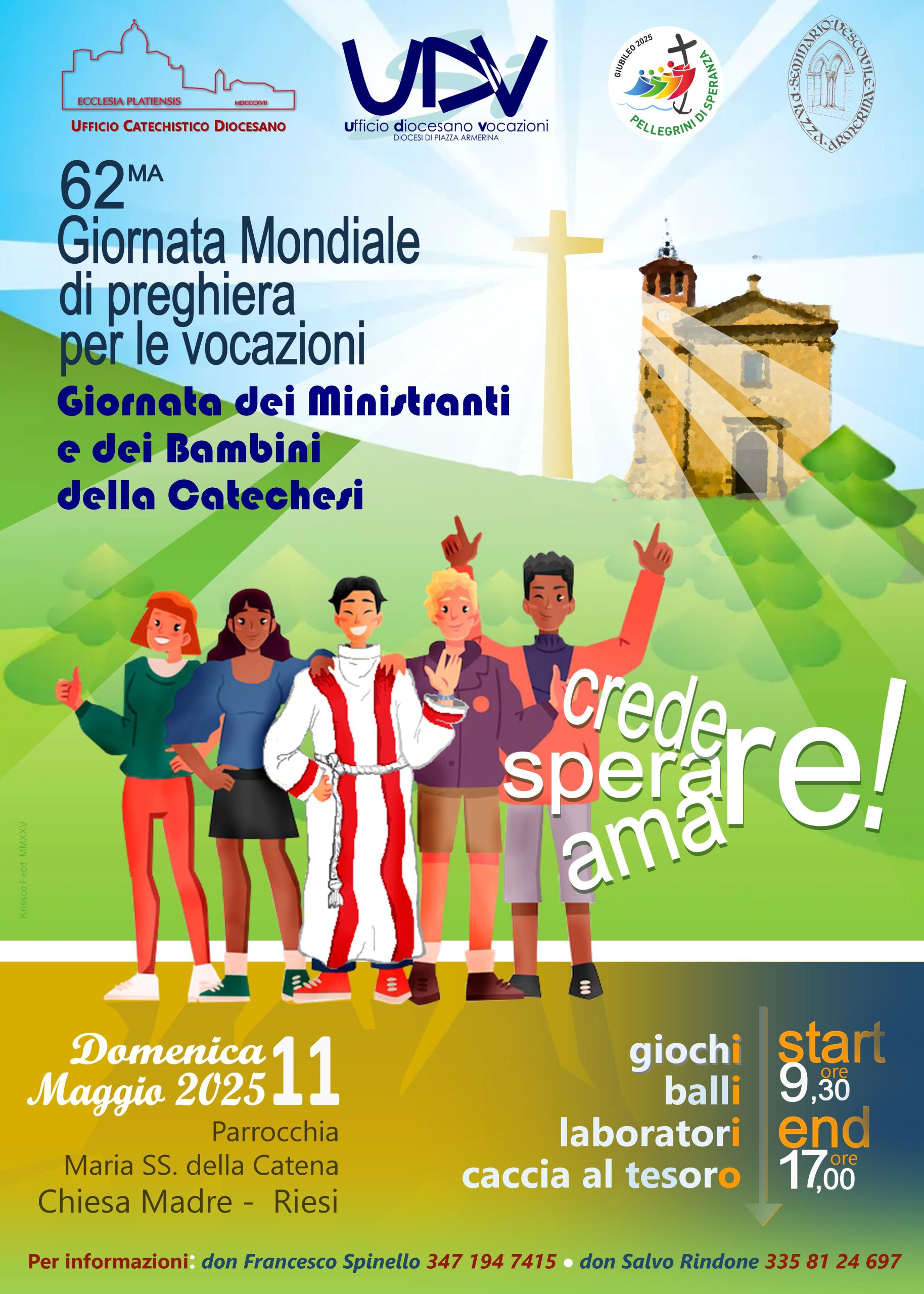 Ritorna domenica 11 maggio 2025 la Giornata dei ministranti e dei bambini della catechesi della Diocesi di Piazza Armerina. Tutte le parrocchie della Diocesi sono invitate a partecipare a questo giorno di festa con i loro gruppi di catechismo e con i ministranti che prestano servizio all’altare. Quest’anno sarà la comunità di Riesi ad accogliere i partecipanti che celebreranno nella domenica dedicata tradizionalmente al “Buon Pastore” anche la 62ma Giornata Mondiale di preghiera per le vocazioni dal tema: “Credere, sperare, amare” (Spes non confundit, 3).