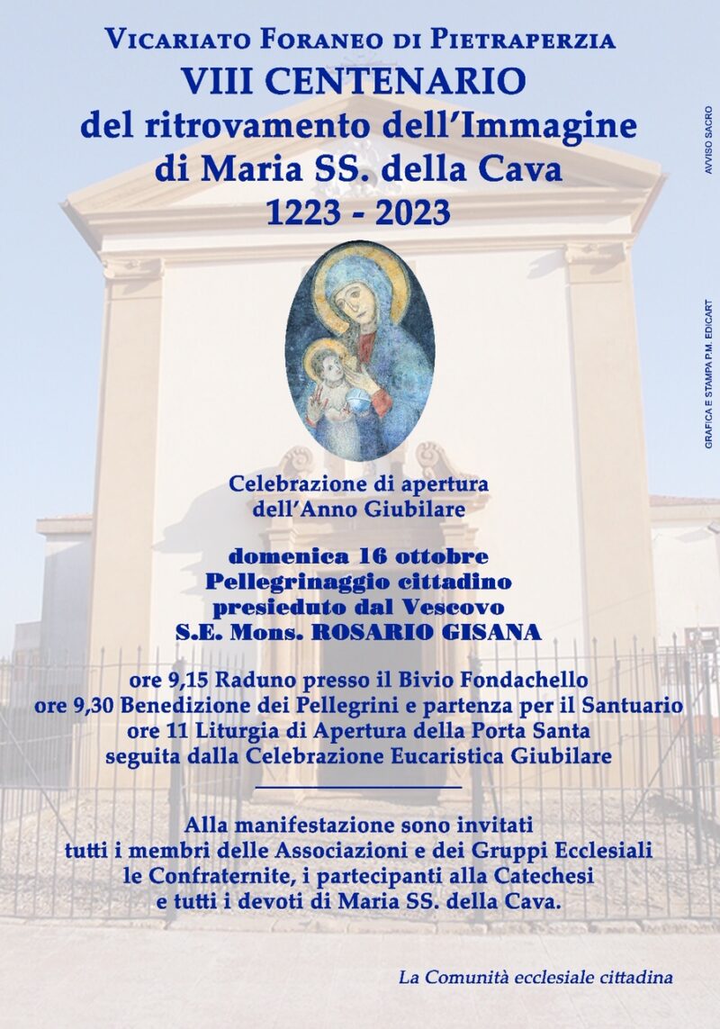 Si apre domenica 16 ottobre, a Pietraperzia un Anno Giubilare (1223 – 2023) per l’VIII centenario del ritrovamento dell’immagine di Maria Santissima della Cava. Alle 9,15 ci si radunerà al Bivio Fondachello e dopo la benedizione dei pellegrini, avrà luogo il pellegrinaggio, presieduto dal vescovo mons. Rosario Gisana, verso il Santuario, dove alle ore 11 avrà luogo la Liturgia di apertura della Porta Santa e la Celebrazione Eucaristica.