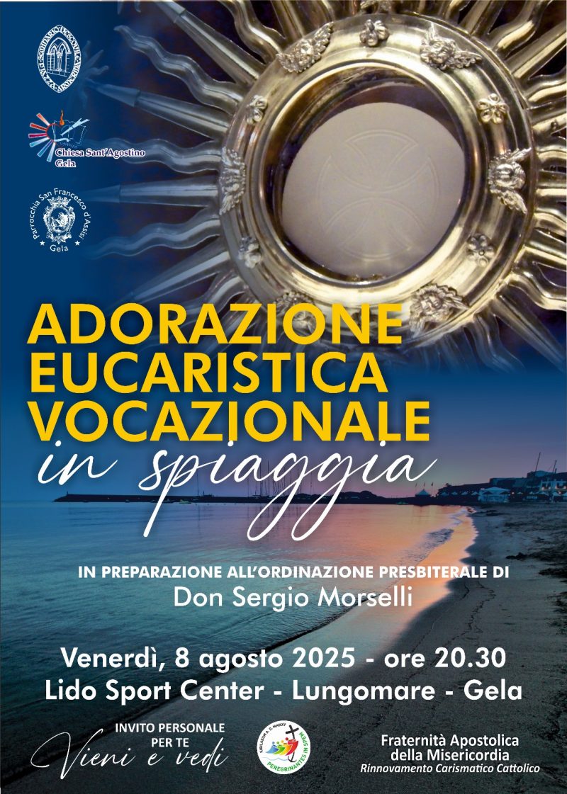 Venerdì 8 luglio alle ore alle ore 20.30 presso il Lido0 sport center del lungomare di Gela, avrà luogo un’ Adorazione Eucaristica Vocazionale in spiaggia in Adorazione Eucaristica Vocazionale in spiaggia. Don Sergio sarà ordinato presbitero l’indomani, sabato 9 agosto nella chiesa Madre di Gela alle ore 18.30, dal vescovo mons. Rosario Gisana. Don Sergio era stato ordinato diacono il 5 luglio del 2024 nella … Continue reading Adorazione Eucaristica Vocazionale in spiaggia »
