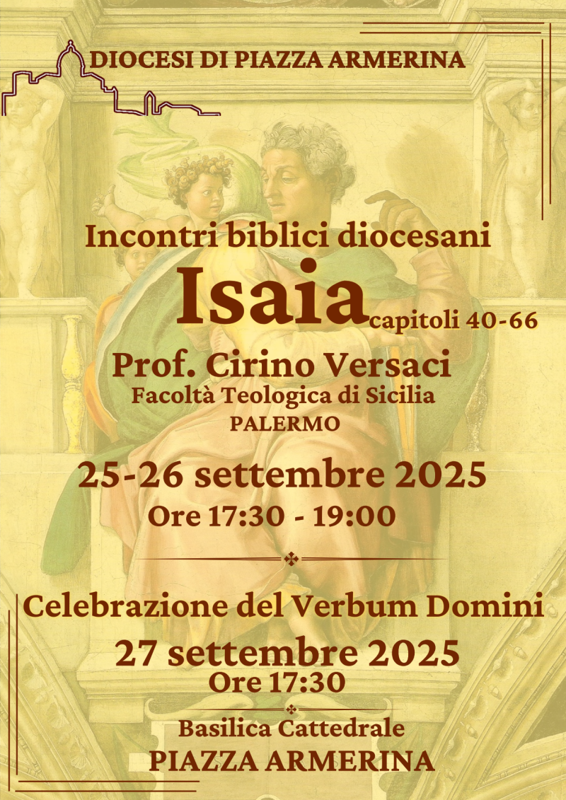 Il 25 e il 26 settembre prossimi, presso la Basilica Cattedrale avranno luogo gli incontri biblici diocesani sul libro del profeta Isaia. Gli incontri precedono la festa del Verbum Domini del 27 settembre che darà avvio alla Lectio Divina in tutte le parrocchie della Diocesi. Quest’anno in continuazione con l’anno Pastorale 2024/2025 si continua con i capitoli 40-66 del libro del profeta Isaia. Sarà il … Continue reading Incontri biblici diocesani e festa del Verbum Domini »