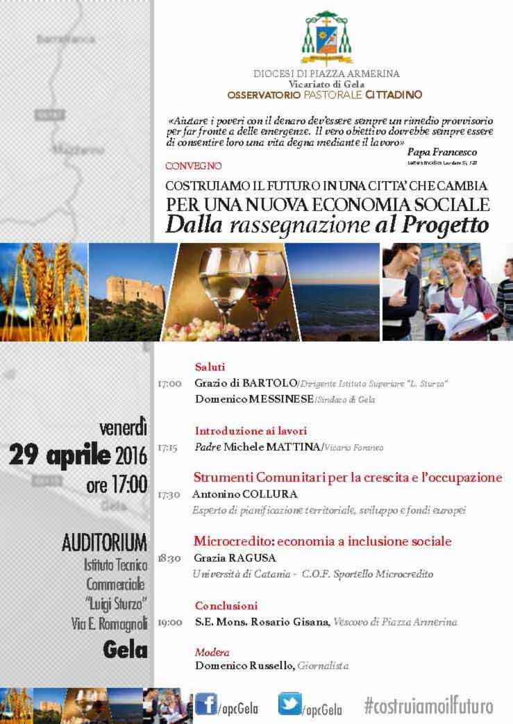 Costruiamo il futuro in una città che cambia: dalla rassegnazione al progetto. Per una nuova economia sociale”. È questo il titolo del convegno promosso dalla diocesi di Piazza Armerina tramite l’Osservatorio Pastorale Cittadino  di Gela voluto fortemente dal vescovo mons. Rosario Gisana e che avrà luogo, venerdì 29 aprile alle ore 17 presso l’Auditorium dell’Istituto tecnico Commerciale “Luigi Sturzo” di Gela. L’Osservatorio Pastorale Cittadino  è composto da laici impegnati con una significativa  esperienza di animazione sociale, provenienti da tutte le parrocchie della città di Gela ed è presieduto dal Vicario Foraneo, don Michele Mattina ed è stato costituito in supporto al Servizio del Vescovo, con la missione  di sostenerlo nella sua  azione pastorale. Il convegno s’inserisce in un contesto socio economico, quello di Gela, ma anche del comprensorio, particolarmente complesso, caratterizzato da profondi mutamenti socio economici e si propone di gettare le basi per una autentica, libera e giusta strada di condivisione dell’emergenza occupazionale e nello stesso tempo di azione sinergica di tutta la comunità civile ed ecclesiale a sostegno di quanti sono senza un lavoro. Il convegno è aperto a tutta la cittadinanza, ha lo scopo di fornire un quadro complessivo di alcuni degli strumenti utilizzabili per creare “Nuova occupazione” la cui caratteristica fondamentale sarà la dimensione solidaristica dell’azione della comunità che significa in sostanza, far diventare le esigenze dell'”altro” esigenze di tutti, tramite la collaborazione in termiti di sussidiarietà. Il convegno vuole essere un occasione di ricerca collettiva per abitare il presente.