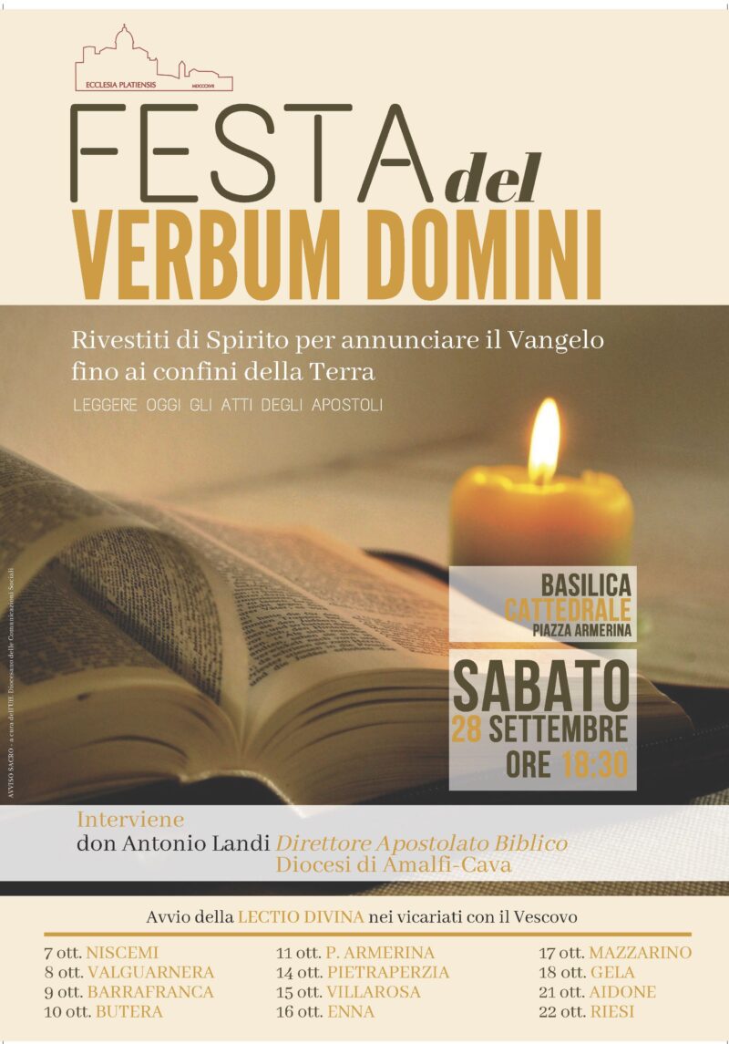 La festa che sarà celebrata in ogni Vicariato con la presenza del Vescovo, darà avvio alla pratica della Lectio Divina . In calendario i seguenti appuntamenti: il 7 ottobre a Niscemi; l’8 ottobre a Valguarnera; il 9 ottobre a Barrafranca; il 10 a Butera; l’11 a Piazza Armerina; il 14 ottobre a Pietraperzia; il 15 a Villarosa; il 16 ad Enna; il 17 a Mazzarino; il 18 a Gela; il 21 ottobre a Aidone e il 22 Riesi.