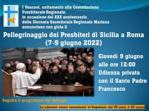 “I vescovi e i presbiteri delle Chiese di Sicilia avremo la gioia, nei giorni 7 – 9 giugno 2022, di realizzare un pellegrinaggio a Roma in occasione del XXX anniversario della Giornata Sacerdotale Regionale Mariana. Ritrovarsi insieme per vivere momenti di fraternità e di spiritualità è sempre un’occasione propizia per crescere nella comunione presbiterale”. Così mons. Guglielmo Giombanco, vescovo di Patti e delegato CESi per il Clero, in un messaggio ai presbiteri diffuso anche attraverso un depliant che spiega il senso profondo dell’evento che prevede anche l’udienza privata con Papa Francesco e che fornisce anche le informazioni utili alla partenza.