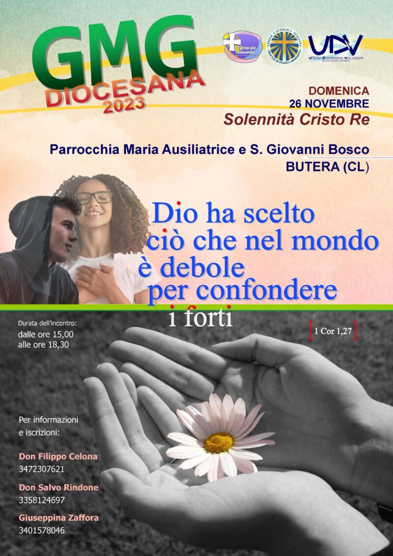 Avrà luogo il 26 novembre solennità di Cristo Re dell’universo la GMG per i giovani della Diocesi. Organizzata in sinergia dagli uffici diocesani Pastorale giovanile, vocazionale e dall’Azione Cattolica diocesana, la GMG diocesana si svolgerà presso la parrocchia Maria Ausiliatrice e San Giovani Bosco di ButeraTema della giornata che avrà inizio alle 15 “Dio ha scelto ciò che nel mondo è debole per confondere i forti” 1Cor 1,27.