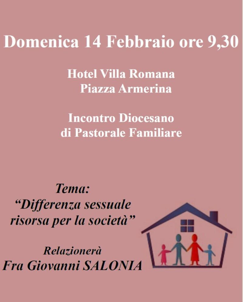 Continuano gli incontri diocesani della pastorale familiare. Domenica 14 febbraio a Piazza Armerina, presso l’hotel Villa Romana, con inizio alle ore 9.30 si riuniscono i gruppi famiglia che in quest’incontro del mese di febbraio sono aiutati nella riflessione da p. Giovanni Salonia sul tema “Differenza sessuale risorsa per la società”.
