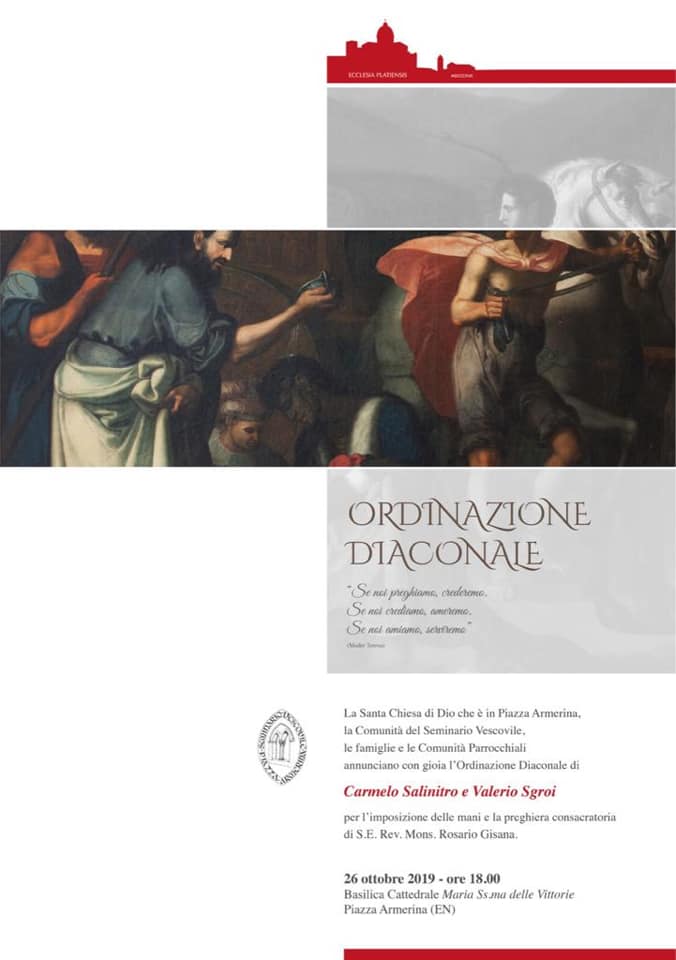 Il prossimo 26 ottobre alle ore 18, nella Cattedrale di Piazza Armerina il vescovo mons. Rosario Gisana ordinerà due nuovi diaconi, Carmelo Salinitro e Valerio Sgroi, alunni del seminario diocesano. Due giovani, con età, storie e percorsi diversi ma accomunati dalla vocazione sacerdotale.
