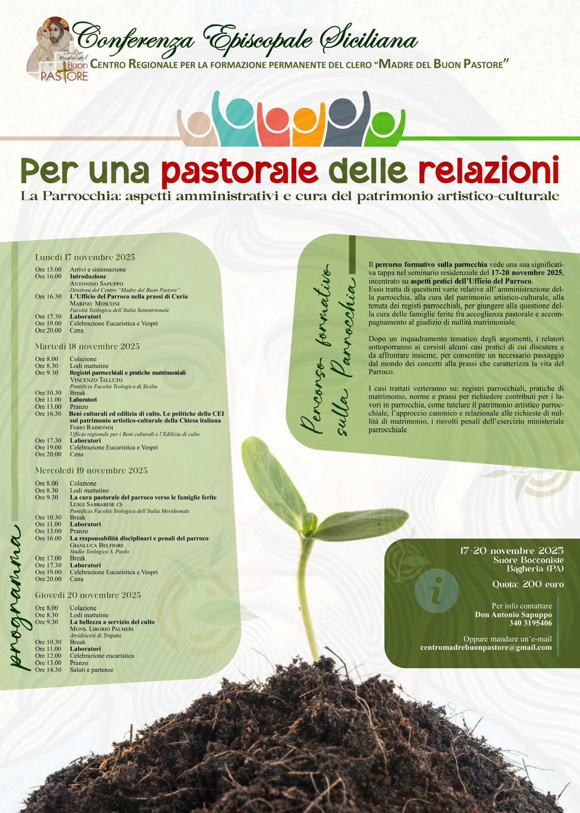 Si svolgerà dal 17 al 20 novembre presso le suore bocconiste di Bagheria (Pa) il percorso formativo sulla Parrocchia organizzato dal centro regionale per la formazione permanente del clero “Madre del buon Pastore” della Conferenza Episcopale siciliana.
