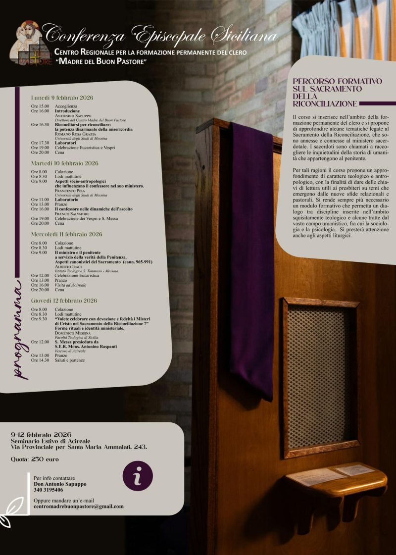 Si svolgerà dal 9 al 12 febbraio prossimi presso il Seminario estivo di Acireale il percorso formativo sul Sacramento della Riconciliazione dal titolo: “Il ministero del confessore: amare, ascoltare, pregare“.