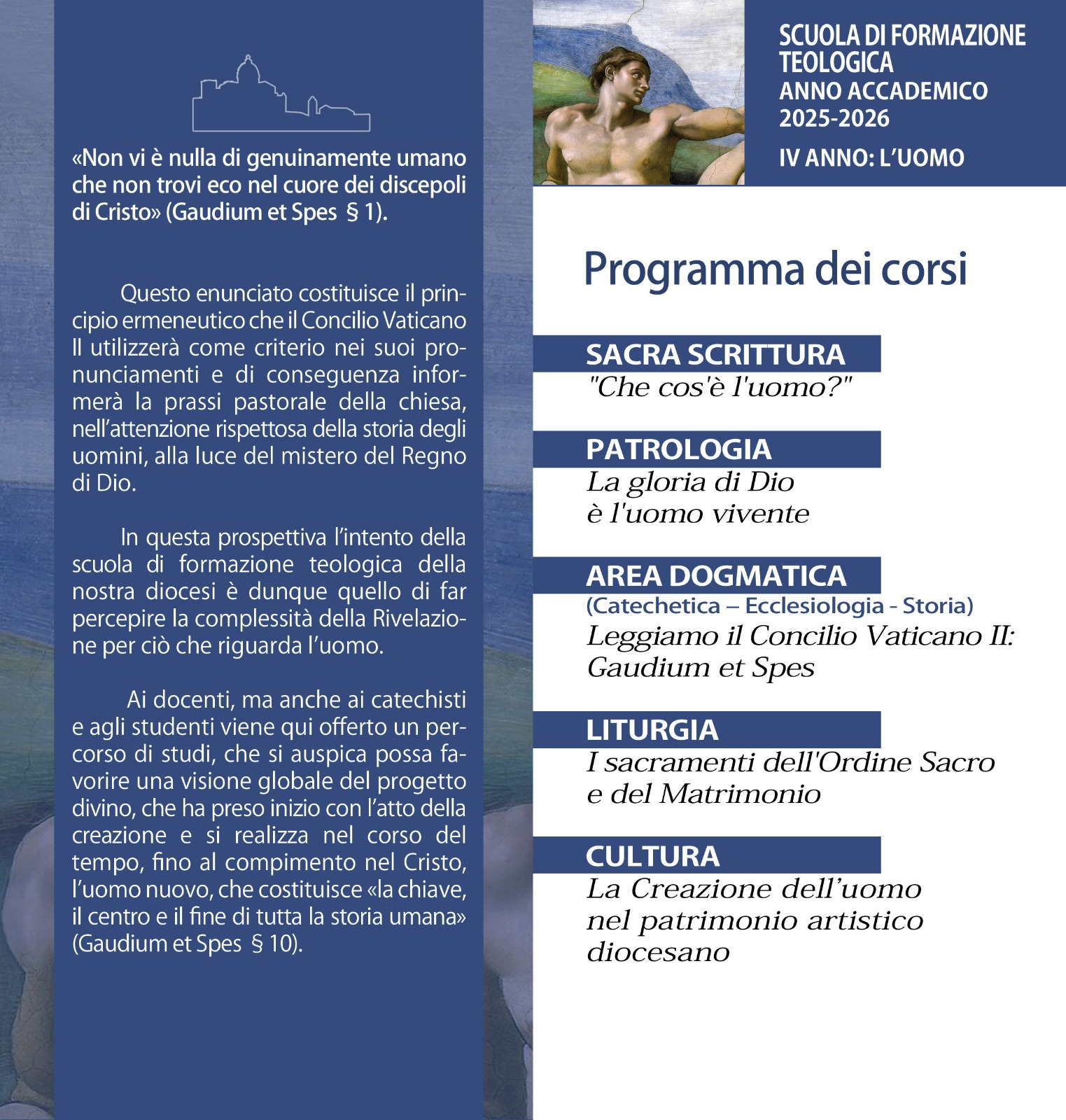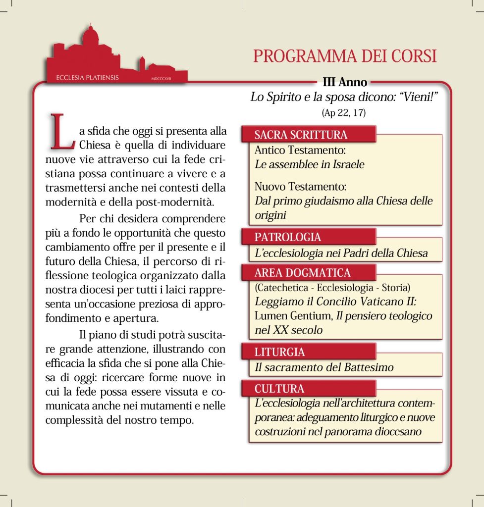 La Scuola propone un percorso per approfondire i temi fondamentali della fede e abilitare a interpretare la vicenda storica – personale, comunitaria e sociale – alla luce della parola di Dio, così da essere “sempre pronti a rendere ragione della speranza” che proviene dalla fede (cfr 1 Pt 3,15).