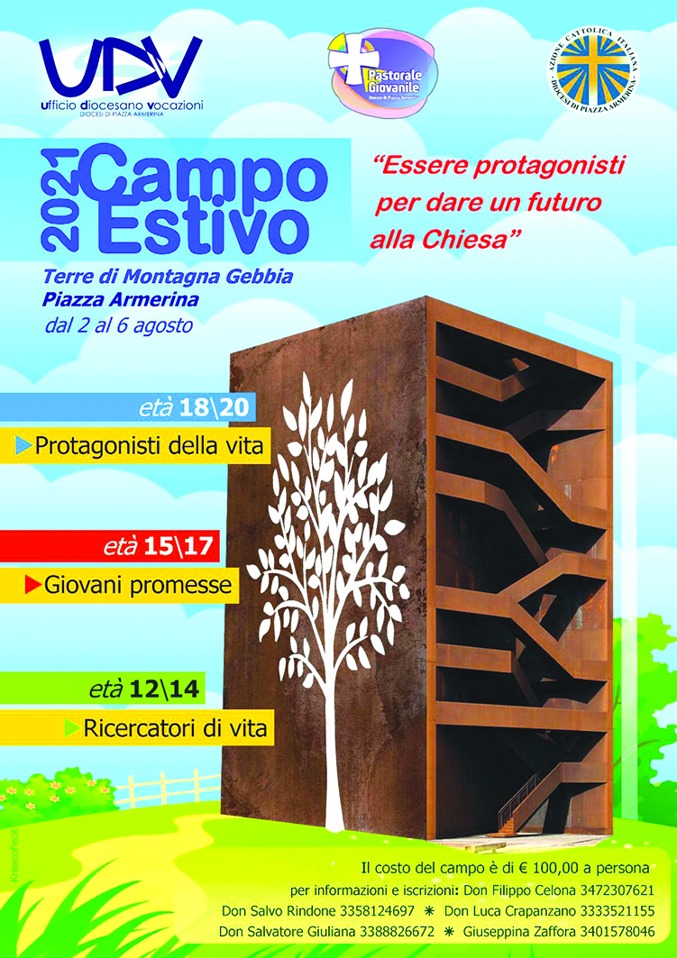 Gli uffici diocesani per le Vocazioni e la pastorale giovanile, in sinergia con Azione Cattolica giovani, organizzano il campo estivo per giovani dal 12 ai 20 anni. “Essere protagonisti per dare un futuro alla Chiesa” è il tema che farà da filo conduttore per la settimana del campo dal 2 al 6 agosto, presso la casa di Spiritualità “Terre di Montagna Gebbia”, (già Seminario Estivo). … Continue reading Campo estivo