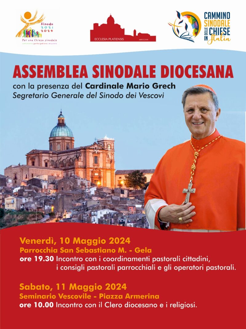 Venerdì 10 e sabato 11 maggio p.v., avrà luogo un’Assemblea Sinodale diocesana con la presenza del cardinale Mario Grech, segretario generale del Sinodo dei Vescovi. Venerdì 10 maggio alle 19.30 presso la parrocchia San Sebastiano di gela, incontrerà i coordinamenti pastorali cittadini, i consigli pastorali parrocchiali e gli operatori pastorali. Sabato 11 maggio, alle ore 10 presso il Seminario Vescovile di via La Bella a … Continue reading Assemblea sinodale diocesana con il Cardinale Grech