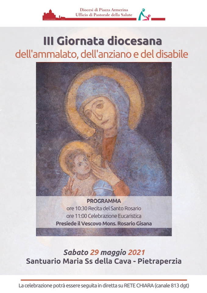 Avrà luogo sabato 29 maggio con inizio alle ore 10.30 la terza giornata diocesana dell’ammalato, dell’anziano e del disabile. Anche quest’anno sarà il Santuario della Madonna della Cava di Pietraperzia ad ospitare l’evento che si aprirà con la recita del Rosario a cui farà seguito la celebrazione della Messa presieduta dal Vescovo mons. Rosario Gisana. La celebrazione potrà essere seguita in diretta su RETECHIARA (canale 813 del digitale terrestre)