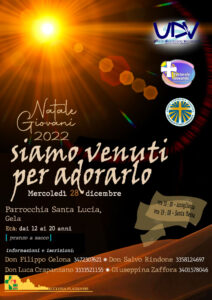 Dopo la celebrazione della GMG Diocesana dello scorso 20 novembre a Piazza Armerina, gli uffici diocesani di Pastorale Giovanile e delle vocazioni, insieme all’Azione Cattolica diocesana, organizzano il Natale Giovani “Siamo venuti per adorarlo”. L’evento si terrà mercoledì 28 dicembre dalle 10 alle 19 (con il pranzo a sacco) nella parrocchia Santa Lucia di Gela ed è rivolto ai ragazzi e giovani dai 12 ai … Continue reading Natale dei giovani della Diocesi