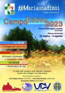 Si svolgerà presso la casa dei salesiani a Montagna Gebbia, dal 31 luglio al 4 agosto il Campo estivo giovani. Il tema del campo organizzato in sinergia dagli Uffici di pastorale giovanile, vocazionale e dall’Azione cattolica giovani avrà come tema #Mariaunadinoi. Il campo è rivolto ai giovani dai 12 ai 20 anni e sarà diviso per fasce d’età: 12 – 14 anni “ricercatori di vita” … Continue reading Campo estivo per giovani