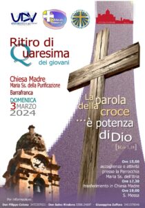 Si terrà quest’anno a Barrafranca domenica 3 marzo il Ritiro di Quaresima dei Giovani. Il tema “La parola della croce è potenza di Dio” scelto dall’équipe di Pastorale Giovanile è tratto dalla Prima Corinzi (1,18), la lettera paolina che quest’anno accompagna la lectio divina diocesana e che richiama l’esperienza e il valore della croce di Cristo nella comunità di Corinto. La citazione rimanda anche alla devozione … Continue reading Ritiro di Quaresima per giovani a Barrafranca