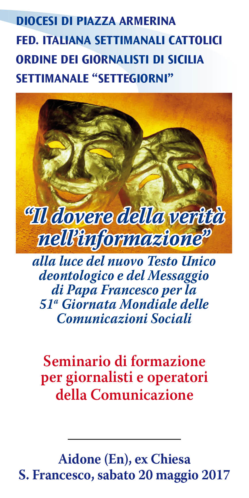 Il seminario, alla luce del Messaggio di Papa Francesco per la 51a Giornata delle Comunicazioni Sociali, intende focalizzare le ricadute nella professione giornalistica della frase del Papa rivolta agli operatori della comunicazione: “Amate la verità, vivete con professionalità, rispettate la dignità umana”.
