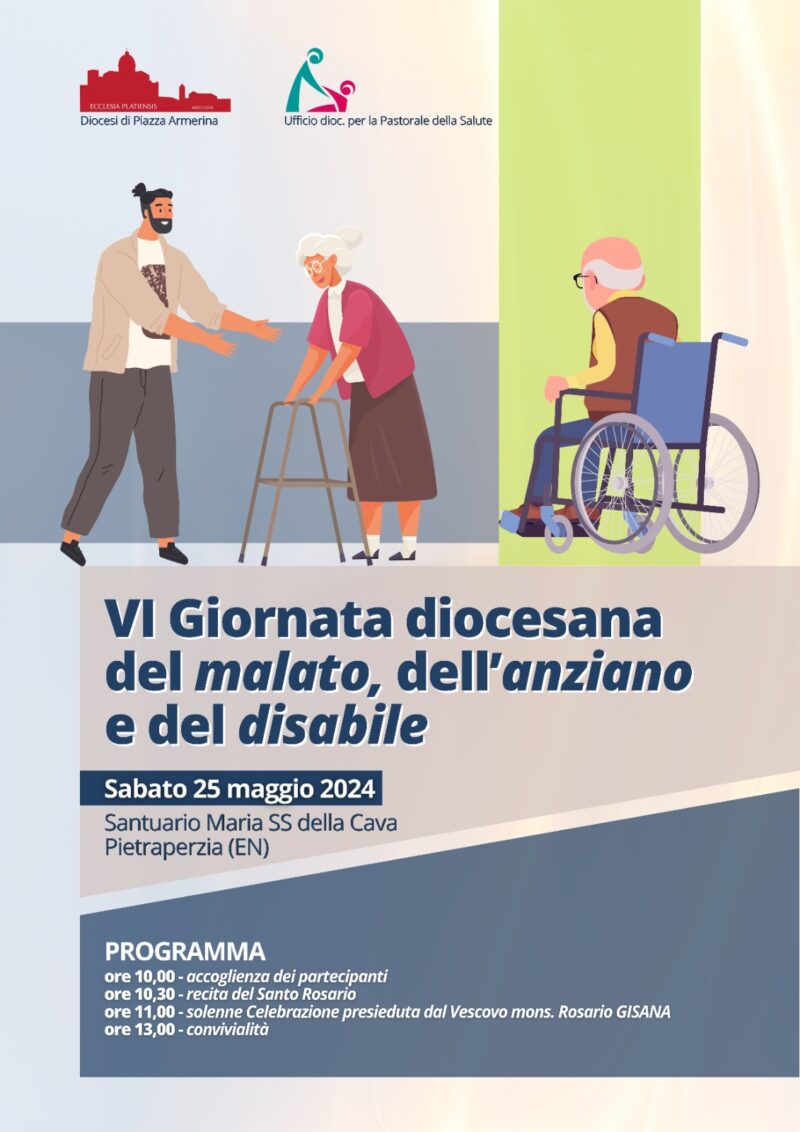 Com’è ormai consuetudine, l’ultimo sabato del mese di maggio si svolge la Giornata diocesana del malato, dell’anziano e del disabile. Sabato 25 maggio, con inizio alle ore 10 presso il Santuario della Madonna della Cava a Pietraperzia si svolgerà la VI Giornata, organizzata dall’ufficio diocesano per la Pastorale della salute, diretto dalla dottoressa Giuseppina Lo Manto. Dopo l’accoglienza, avrà luogo la recita del Rosario a cui seguirà la celebrazione Eucaristica, presieduta dal Vescovo mons. Rosario Gisana. Un momento di convivialità concluderà la Giornata. All’evento, oltre i malati, gli anziani, i disabili sono invitati gli operatori sanitari, i volontari e tutte le associazioni di volontariato. VI Giornata del malato dell’anziano e del dasabile (2).jpg