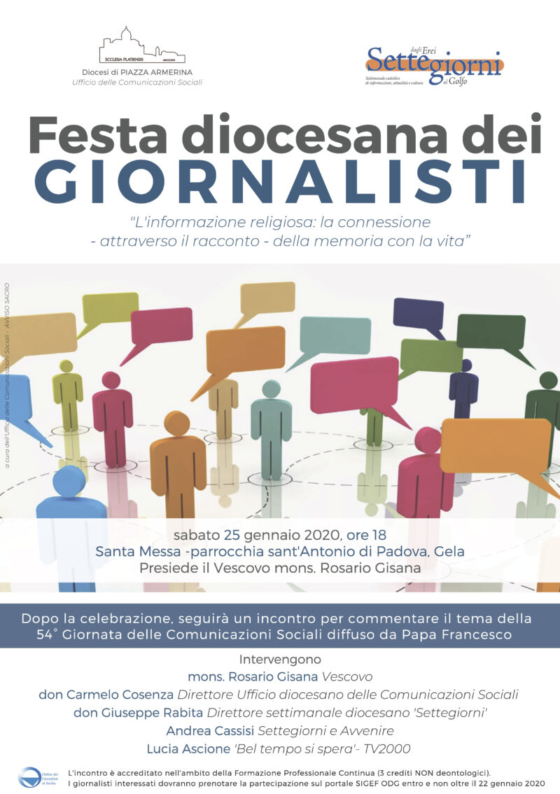 Sabato 25 gennaio, alle ore 18, santa Messa presieduta dal Vescovo mons. Rosario Gisana, presso la parrocchia sant’Antonio di Gela. Subito dopo, incontro nel salone parrocchiale, durante il quale si parlerà di “Informazione religiosa: la connessione – attraverso il racconto – della memoria con la vita”.